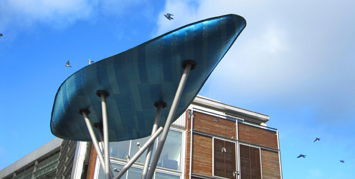 Horie anodized large amounts of titanium for Studio Egret West, who designed large titanium leaf monuments, also known as the The Shoal sculpture for the redevelopment of the Stratford Centre. These large wonderful objects can be found in Stratford, London Borough of Newham and has provided additional color to the 2012 London Olympic Games.